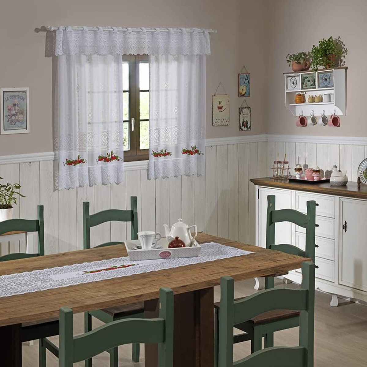 Cortina KazzaVip de Renda 100% Poliéster para Cozinha Valência Morangos com Bando 2,00m x 1,20m Branco