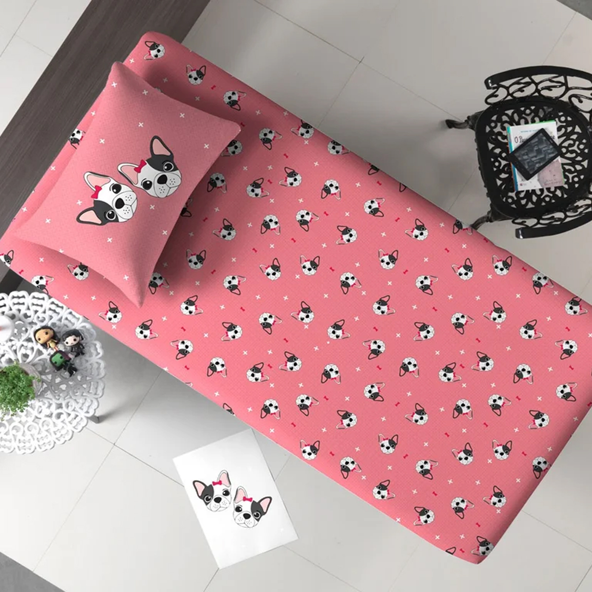 Jogo de Cama Portallar Solteiro Malha Mista 70% Algodão e 30% Poliéster Joy Bulldog Francês 2 Peças Rose