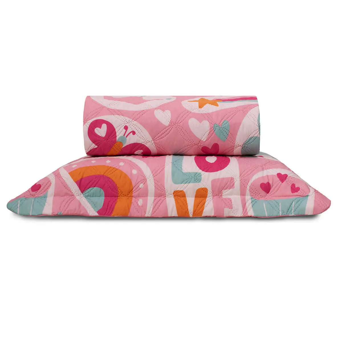 Kit Cobre Leito KazzaVip Solteiro Microfibra Estampado 100% Poliéster Matelassê com Porta Travesseiro Renove Juvenil Love 02 Peças Rosa