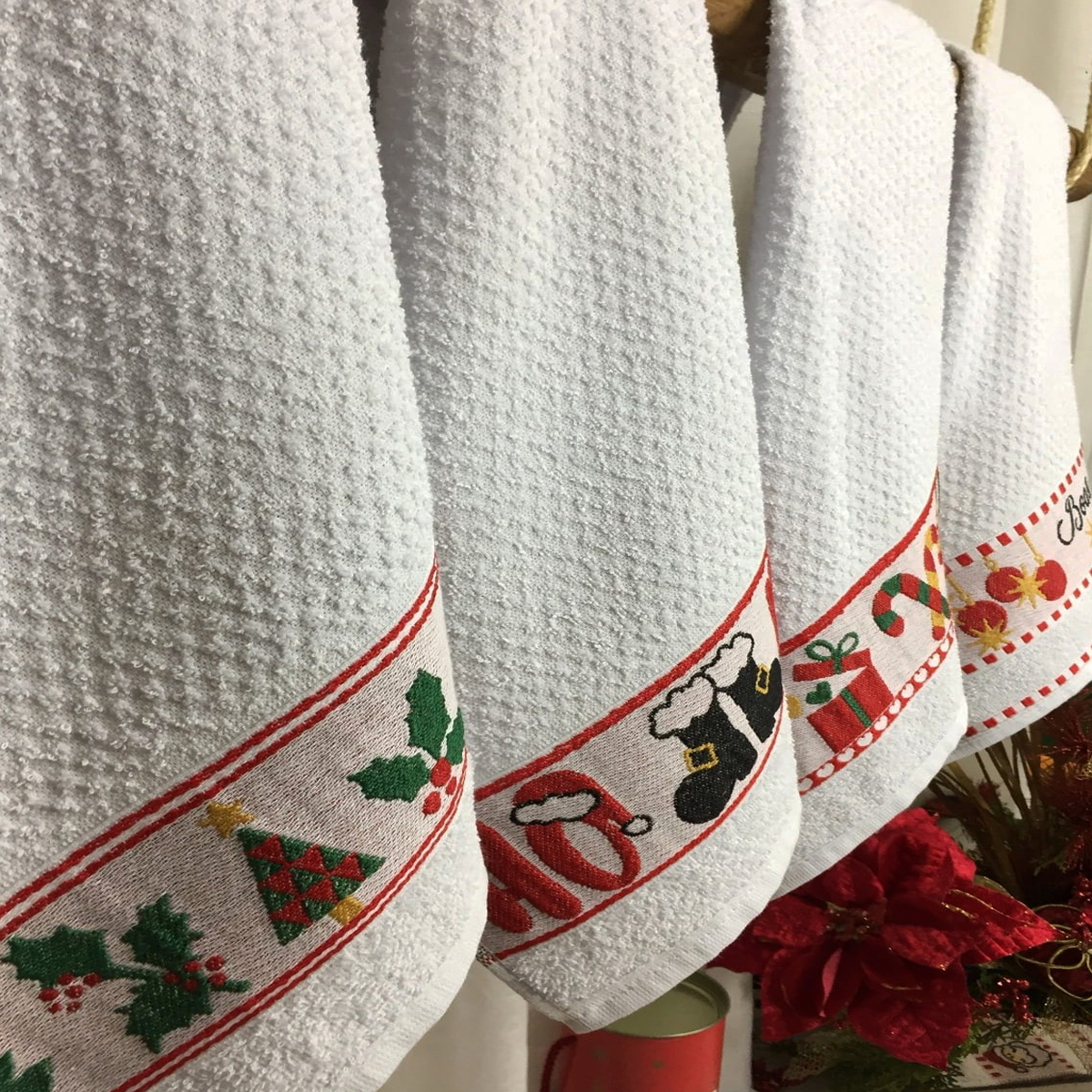 Pano De Prato KazzaVip Felpudo Jacquard Barra Bordada ( 05 Unidades) Natal 50cmx70cm Branco