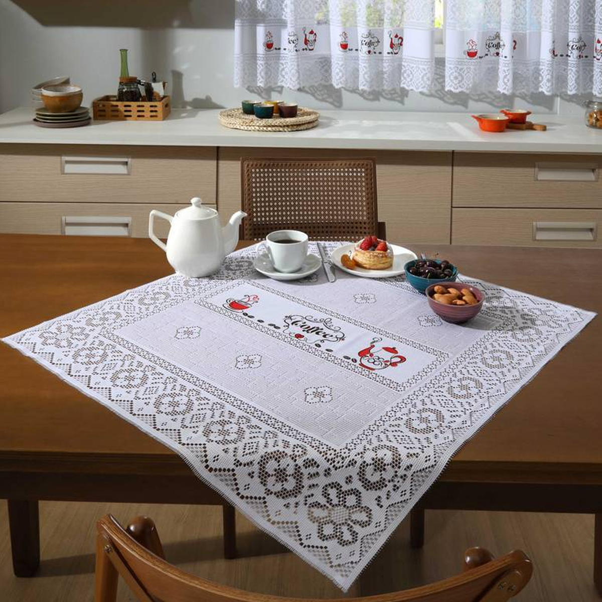 Toalha Centro de Mesa KazzaVip Renda Valência Cafe Vermelho 75cm x 75cm Branco