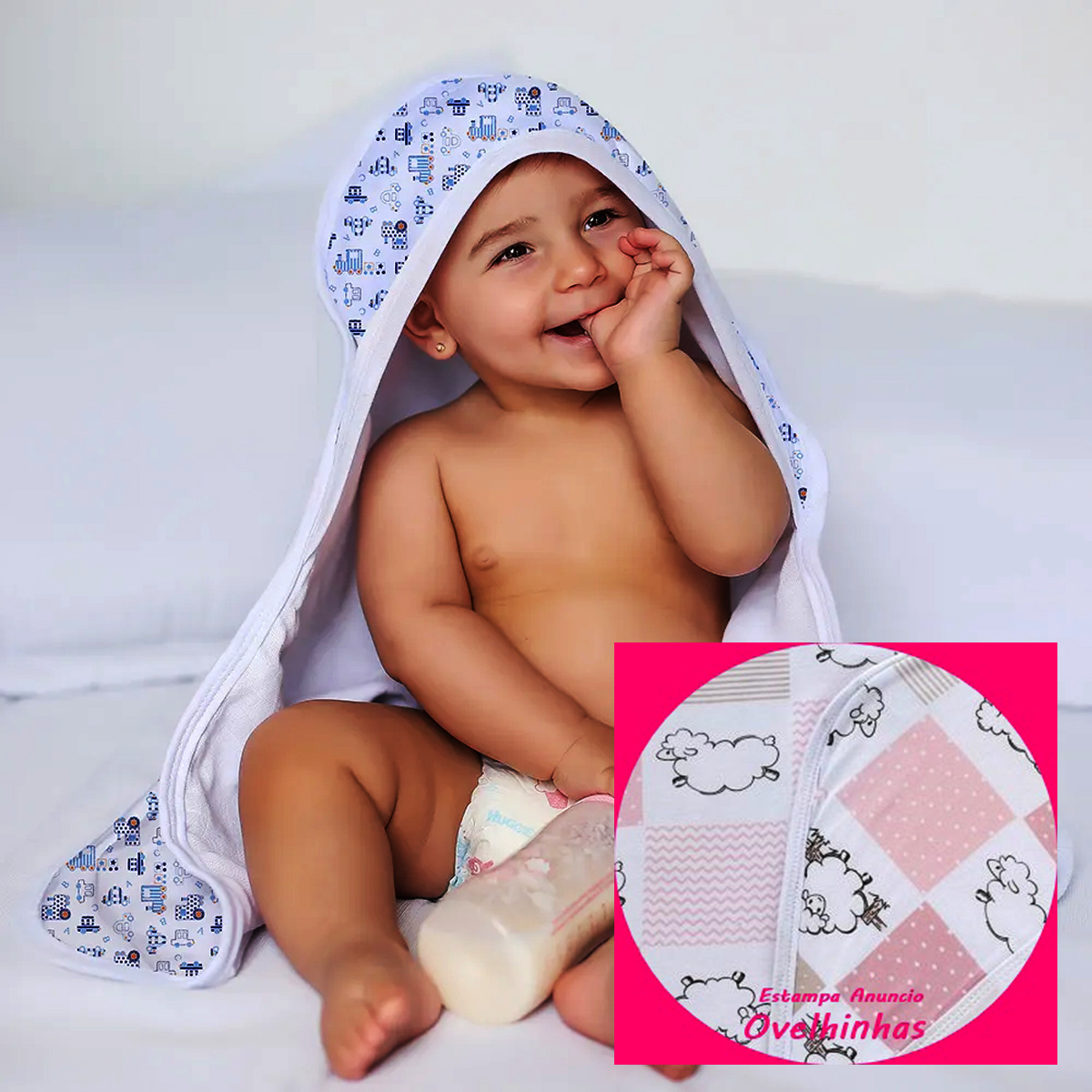 Toalha de Banho Baby Com Capuz e Forro KazzaVip Malha 100% Algodão Estampada Ovelhinhas Branco e Rosa