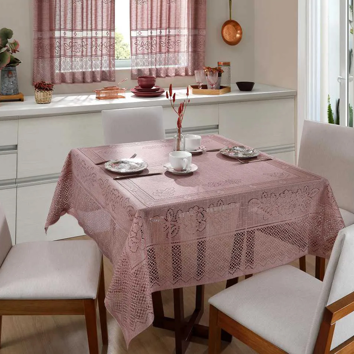 Toalha de Mesa Interlar Renda 100% Poliéster Quadrada Color 150m x 150m 4 Lugares Rose